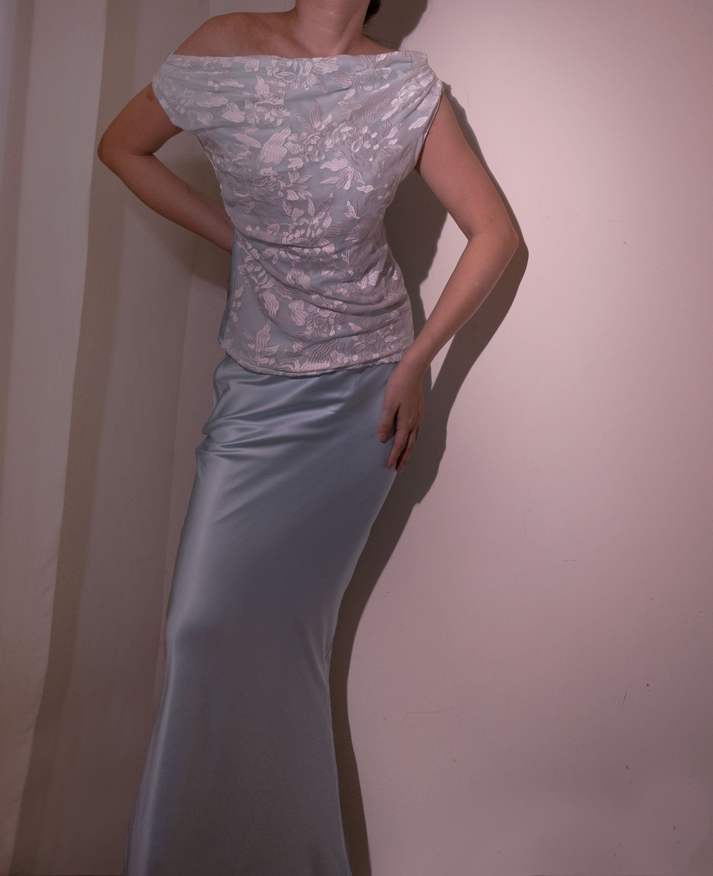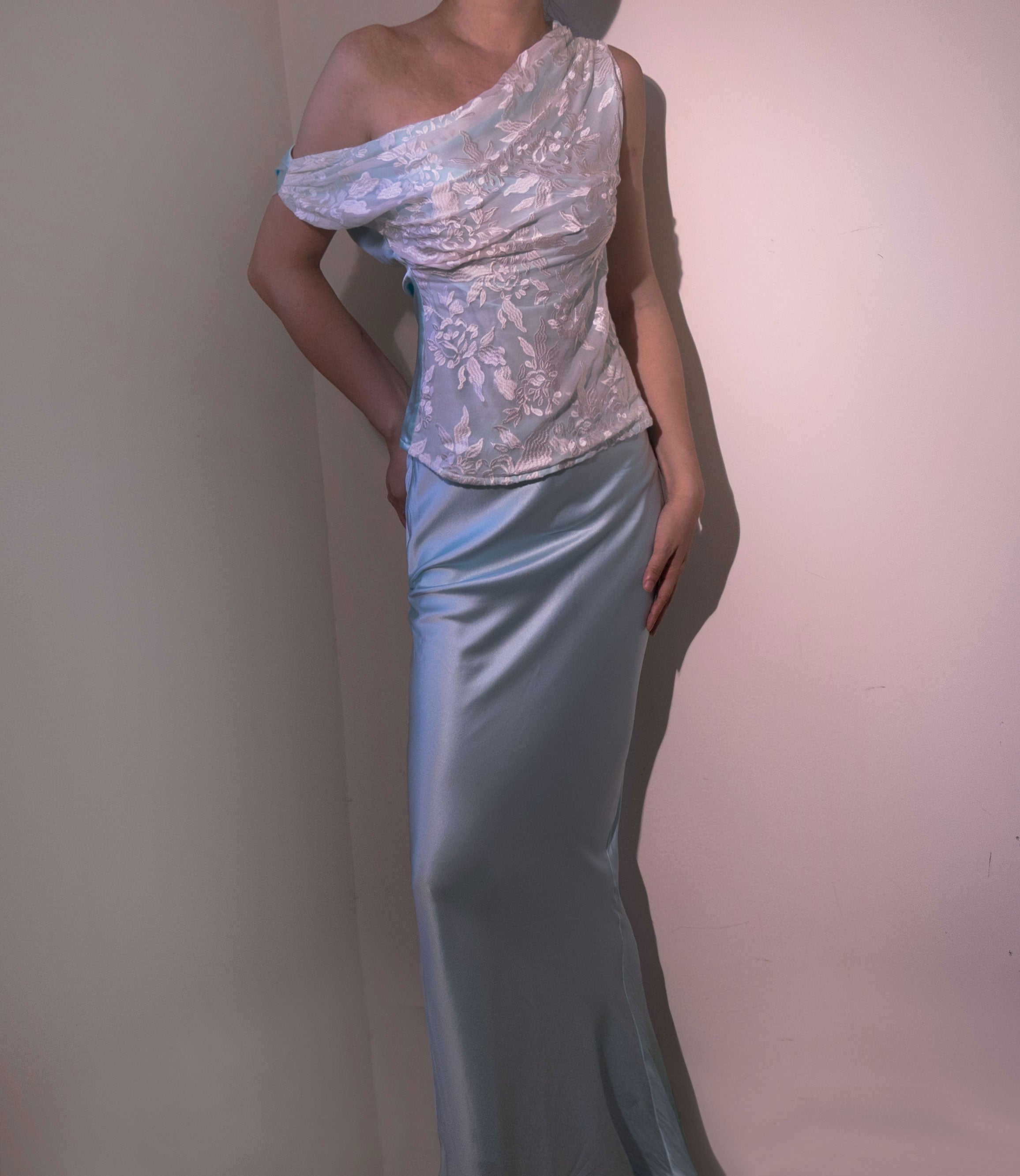 The top of the Arena boasts intricate pleated mulberry lace silk. adding a touch of elegance and sophistication. The skirt is a long flowing masterpiece. made of luxurious blue silk fabric that drapes beautifully and moves effortlessly with every step. The combination of the intricate lace and flowing silk creates a stunning and eye-catching look that is sure to turn heads.