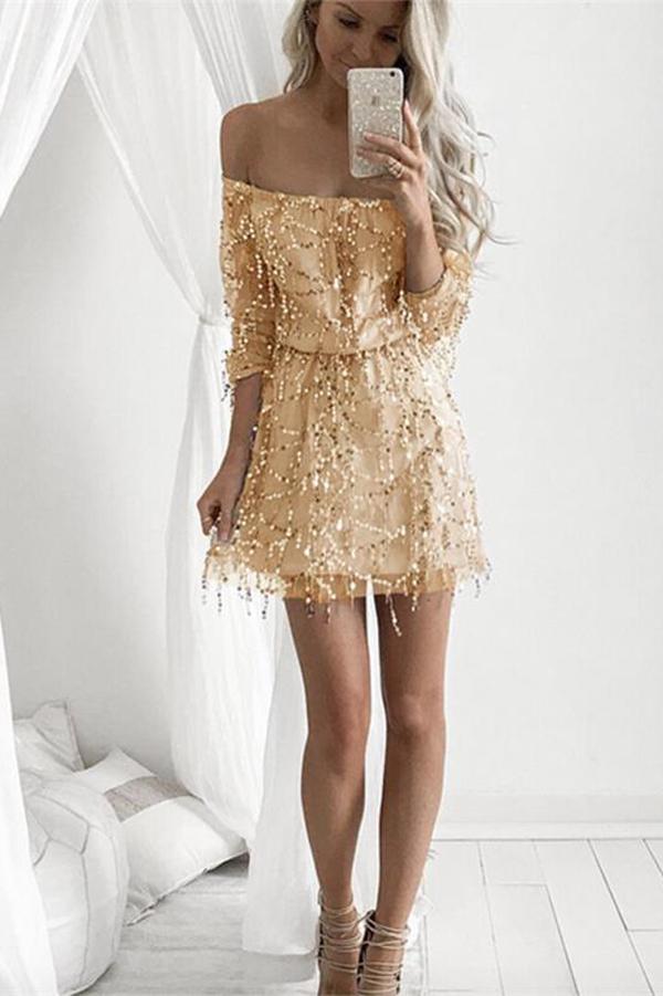 Beaded Off Shoulder Long Sleeve Graduation Dresses Homecoming Dresses