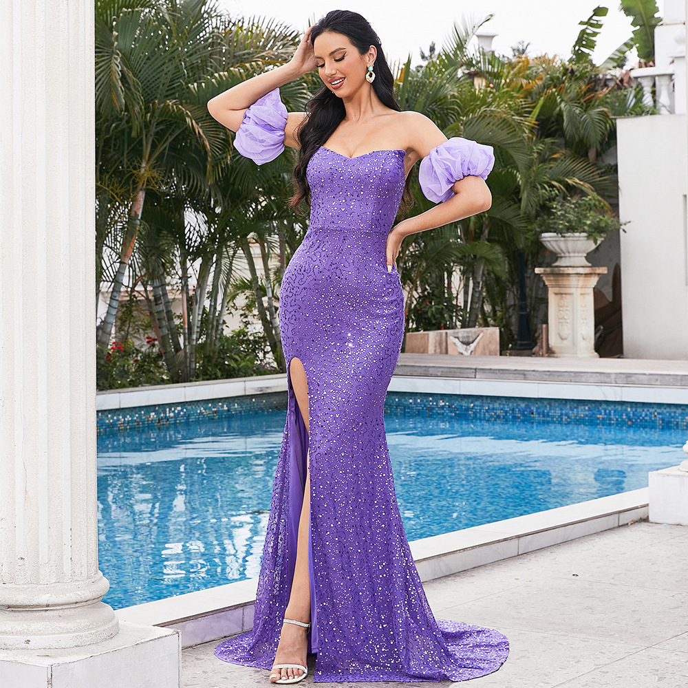 Elegant Sexy Long Sequined Short Sleeve Wrapped Chest Backless Cocktail Evening Dress Bridesmaid Dress Women
